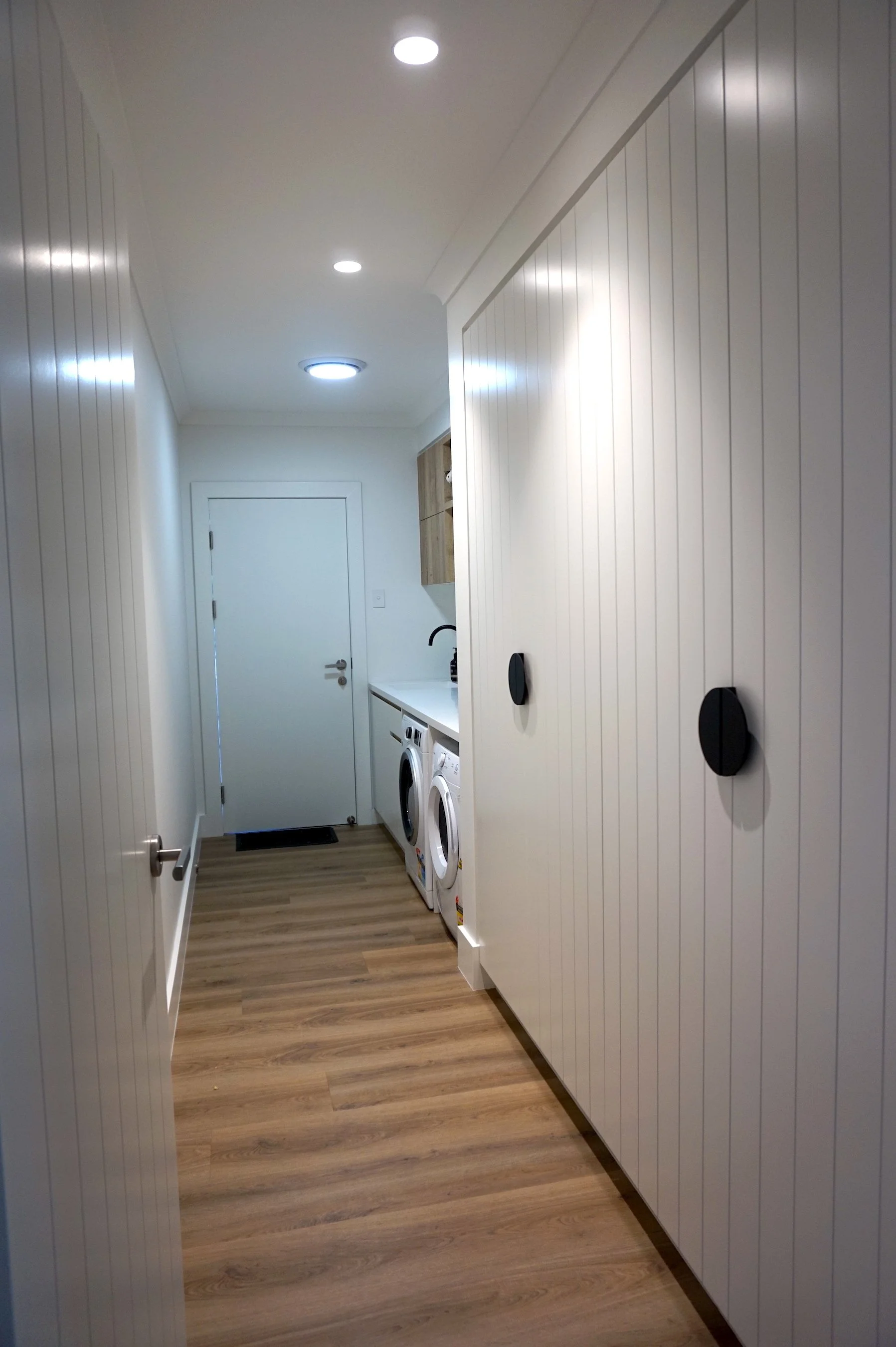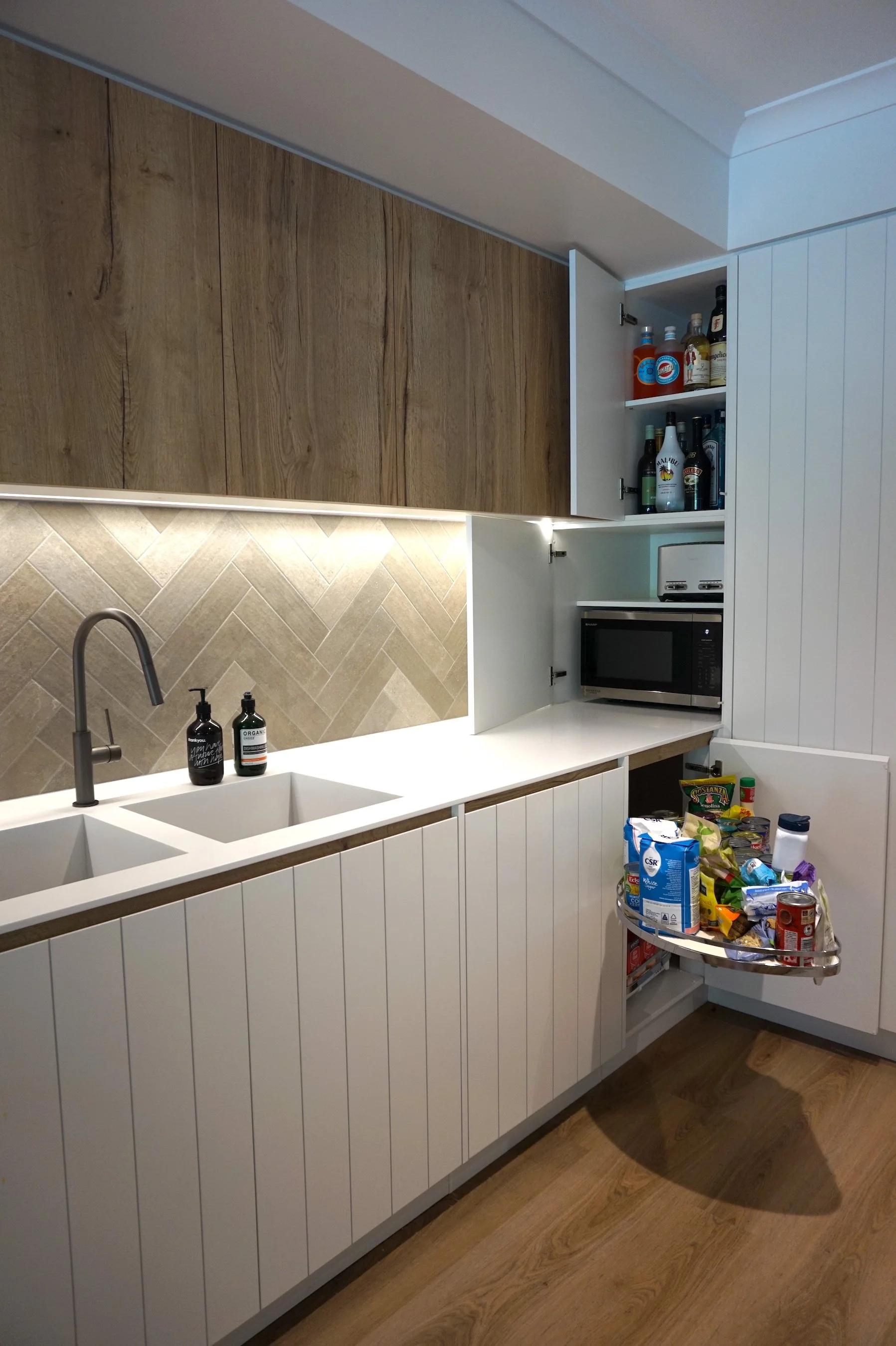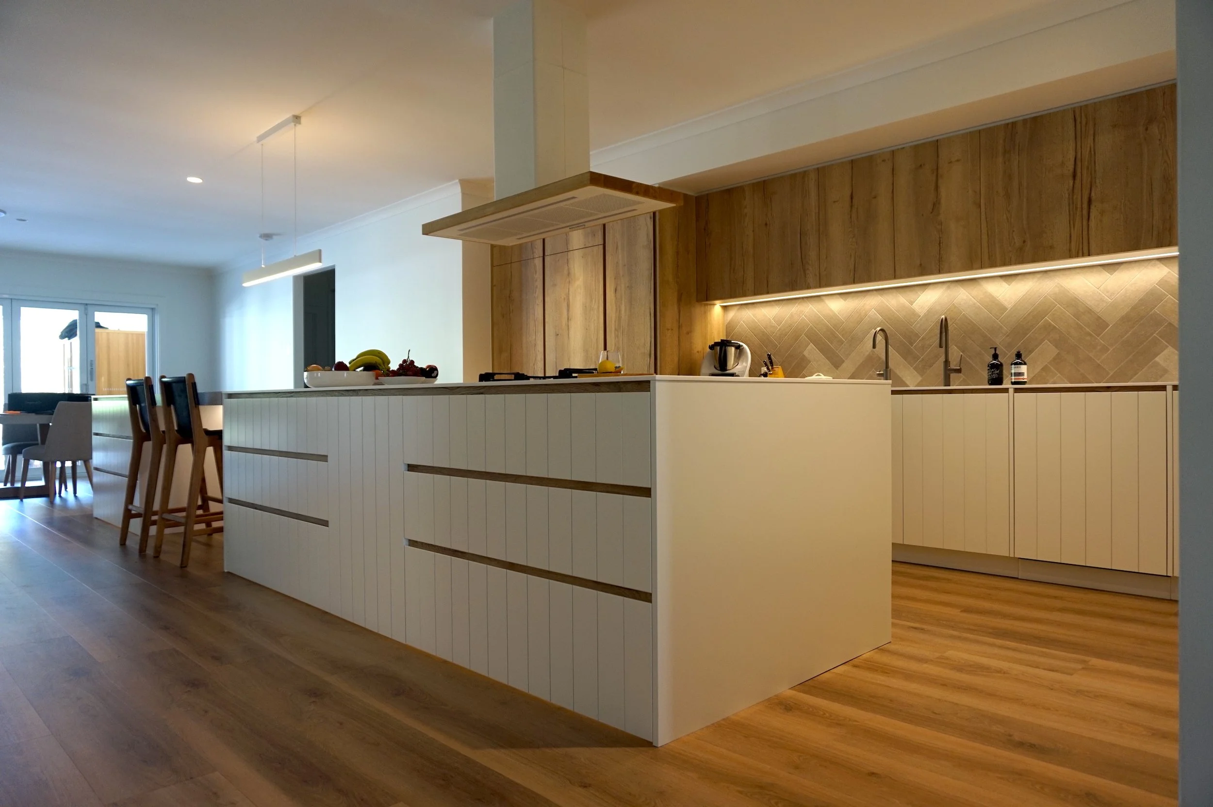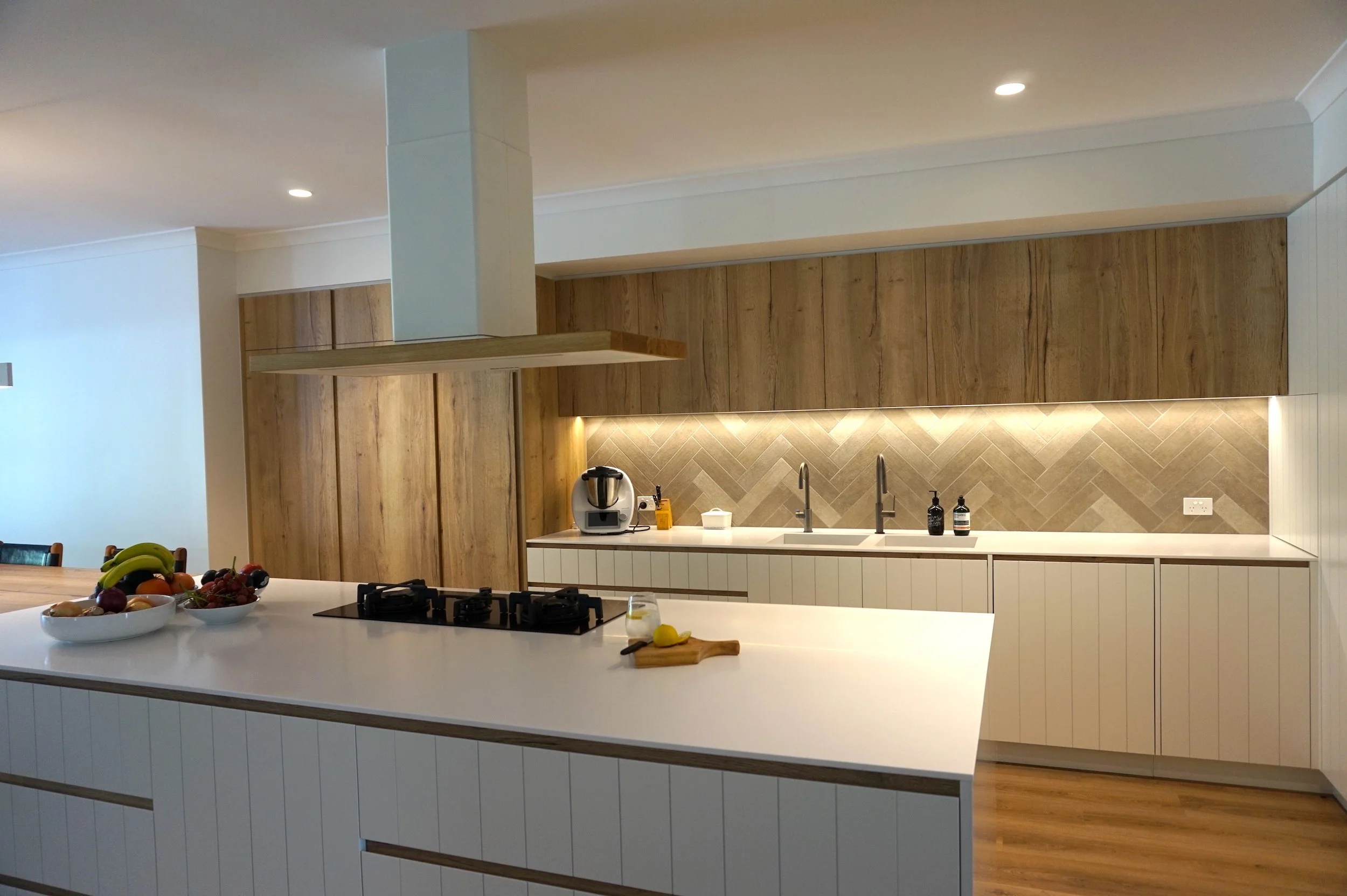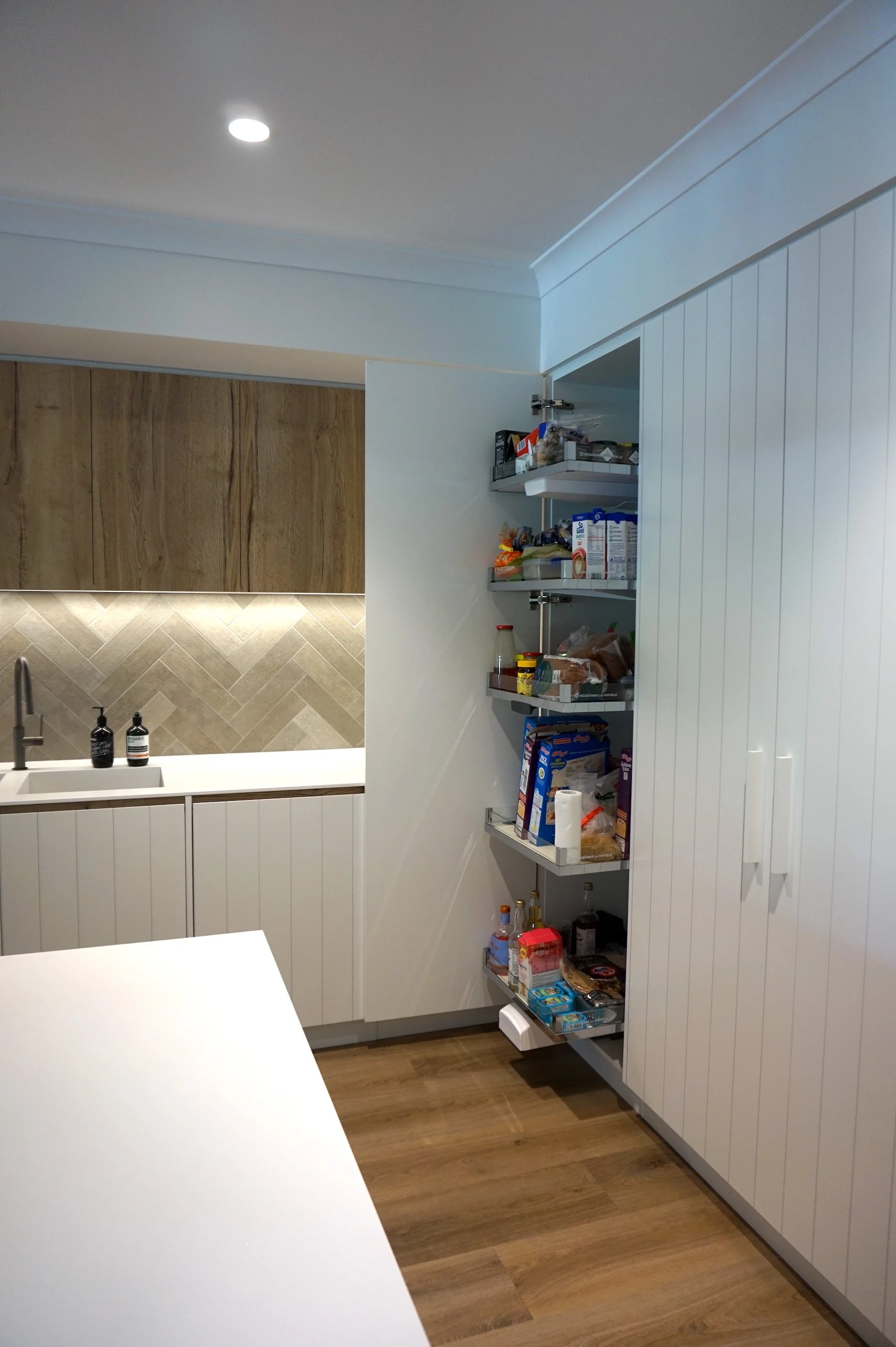 Benchtops Corian Glacier White, 12mm Colourboard Timber Grain Nikpol Natural Halifax on tall cabinetry and overheads, “Bridge” benchtop and fingerpull rail details White Cabinetry 2Pac Paint on VJ doors and panels - Dulux Snowy Mountain 1/2 30% sheen level