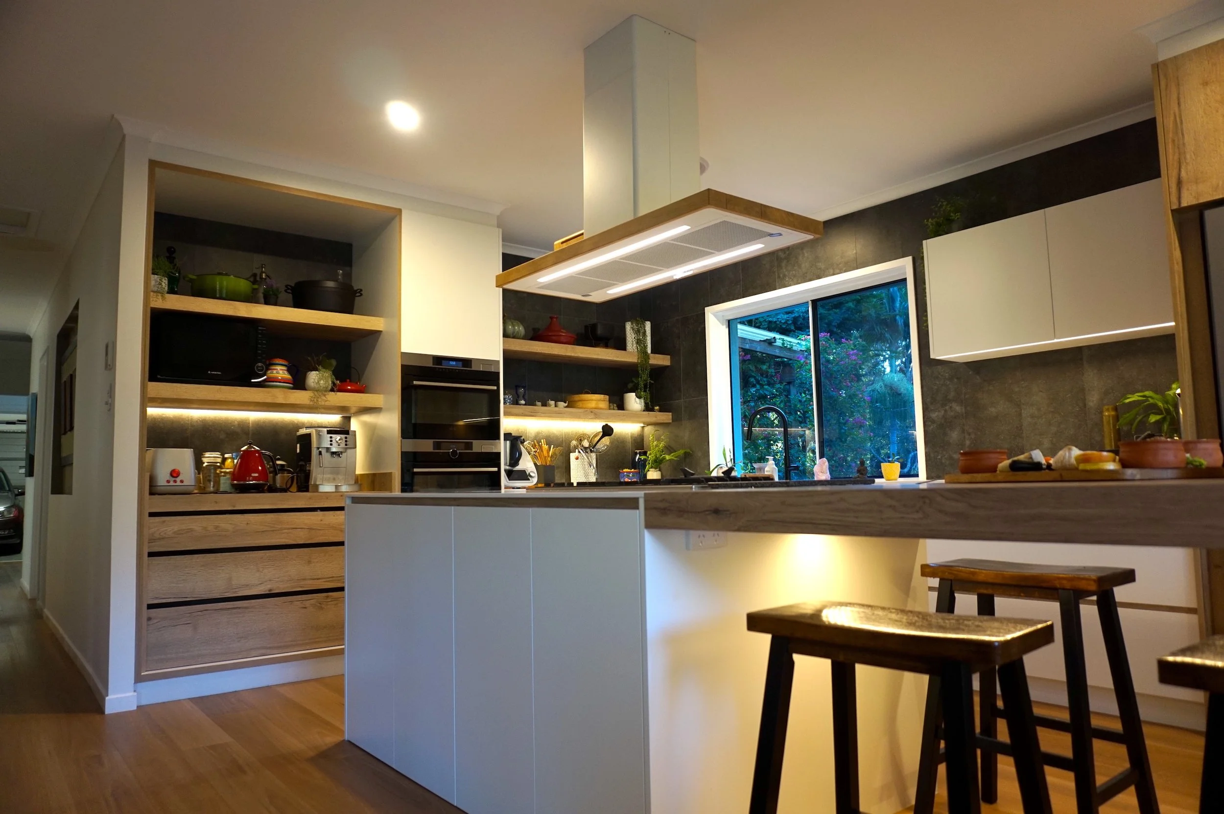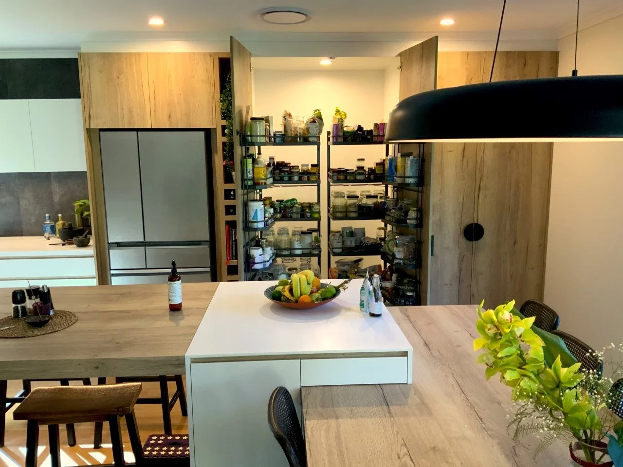 Benchtops Corian Glacier White (12mm on Island bench; 38mm on L-shape back run) Colourboard Timber Grain Nikpol Natural Halifax on tall cabinetry, “Bridge” benchtop, Integrated dining table top and fingerpull rail details White Cabinetry 2Pac Paint - Dulux Snowy Mountain 1/2 30% sheen level