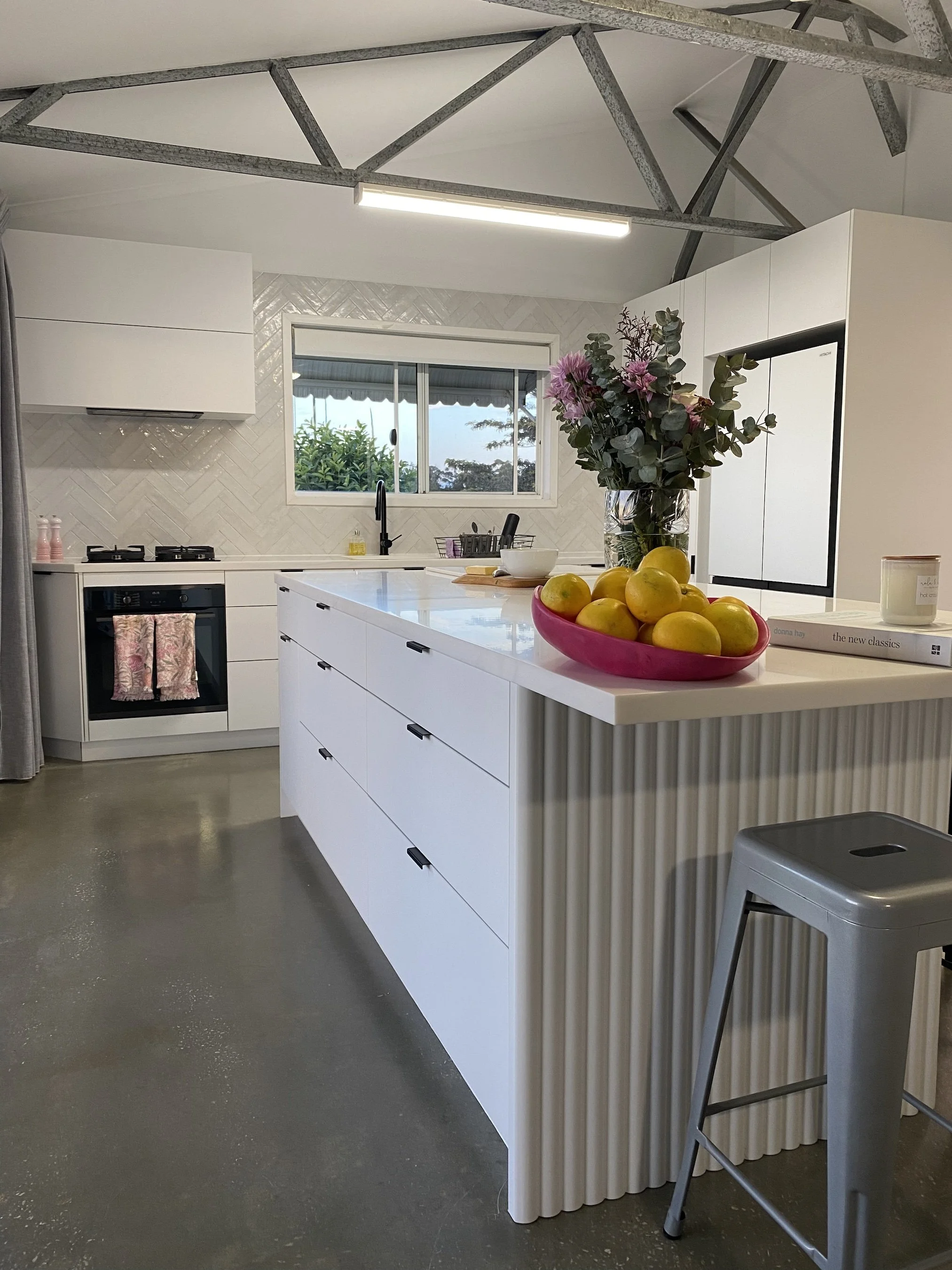 Benchtops 38mm Corian ‘Valente Grigio’ with x1 integrated sink with drainer Island Battens Porta ‘Riverine’ finished in 2Pac paint, 30% sheen level